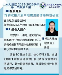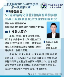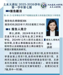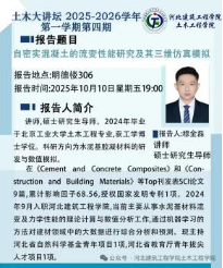 系列讲座中,董捷以《岩土工程与工程软件研发》为题,揭示了专业软件开发与工程实践的紧密联系;刘宏波以《矩形多腔钢管混凝土柱轴压性能研究》为题,展示了对新型结构构件性能的深入探索;王鹏以《SiC泡沫结构化催化剂的典型结构参数对其乙炔氢氯化反应性能的影响研究》为题,引领同学们走进了化学与材料交叉的创新研究领域;孙力强的《建筑行业发展展望》高屋建瓴,帮助同学们洞悉行业未来趋势,规划个人职业发展;穆金磊分享的《自密实混凝土的流变性能研究及其三维仿真模拟》,则展现了现代混凝土技术与数字化仿真结合的强大力量;张波对《饱和双相介质中地震波的传播特性研究》的深入剖析,为同学们理解岩土工程抗震奠定了坚实的理论基础;季艳杰老师带来的《热-水-力-化学耦合作用下硫酸盐盐渍土的结晶过程及力学特性》,揭示了特殊土体在复杂环境下的演变机理,极具科研与实践价值。