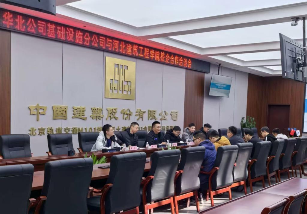 在中建二局华北公司基础设施分公司,双方围绕“产学研用”一体化模式展开座谈,座谈会上,刘晶磊表示,公司在基础设施建设领域经验丰富,希望以校友为纽带,推动双方在人才输送、实习基地建设、产学研项目合作等方面实现优势互补。企业方详细介绍了企业发展战略、业务布局及人才需求情况,并高度认可该校培养的毕业生在企业中的突出表现。
